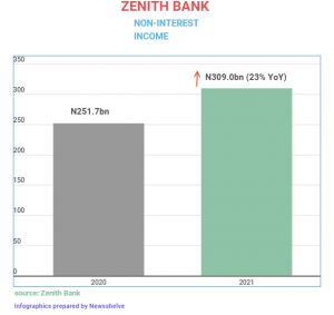 In spite of a challenging macroeconomic environment aggravated by the COVID-19 pandemic, the Zenith Bank Group achieved year-on-year (YoY) growth in gross earnings of 10% from NGN696.5 billion reported in the previous year to N765.6billion. This was on the back of a 23% YoY growth in non-interest income from N251.7billion to N309billion and a 2% YoY growth in interest income from N420.8billion to NGN427.6billion.